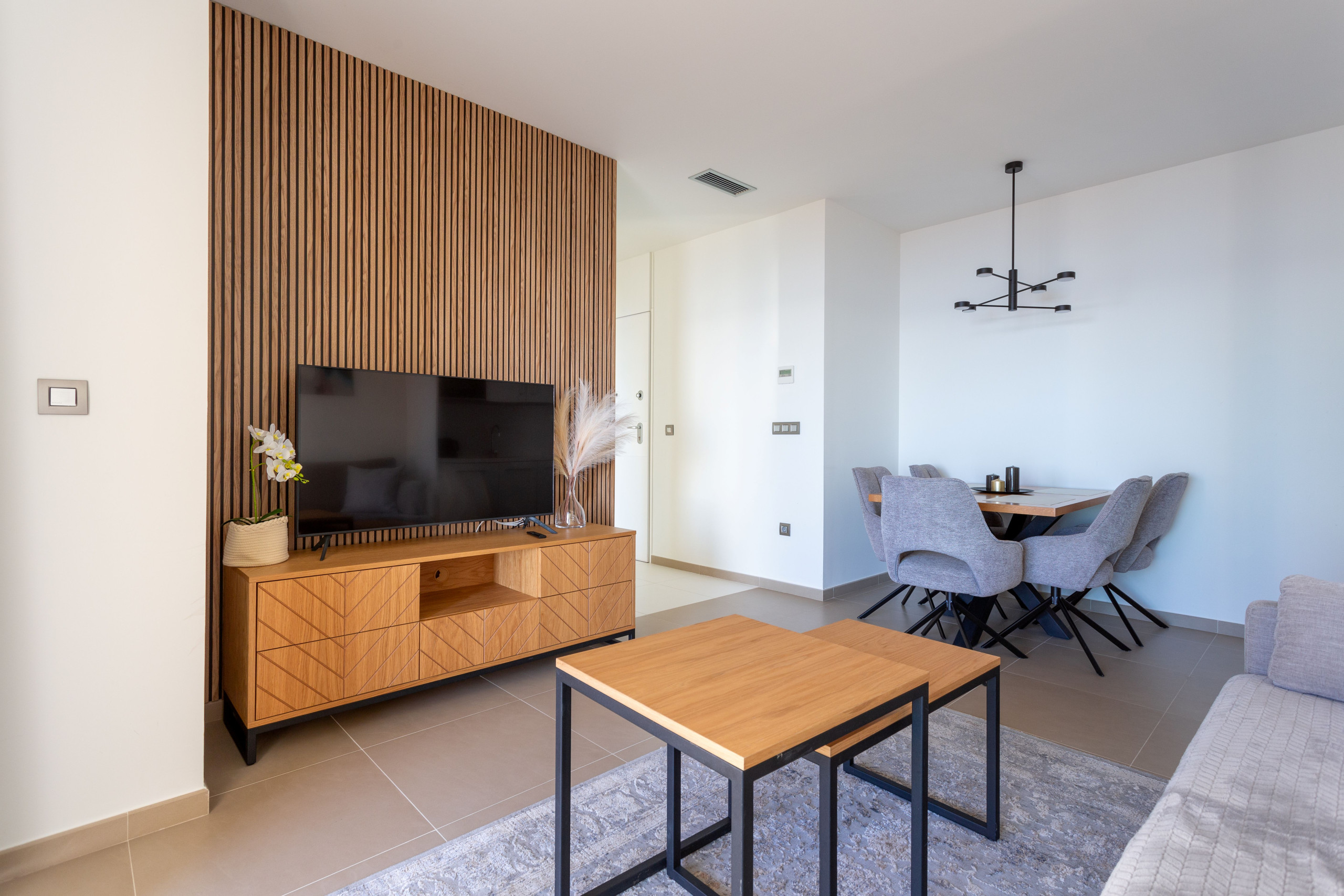 Diese helle 75 Quadratmeter große Wohnung bietet eine vollständig ausgestattete Unterkunft mit 2 Schlafzimmern, die bequem bis zu 4 Personen beherbergen kann. Sie verfügt über eine intelligente Aufteilung, die ein Doppelbett und zwei Einzelbetten umfasst und einen erholsamen Schlaf für alle Gäste gewährleistet.