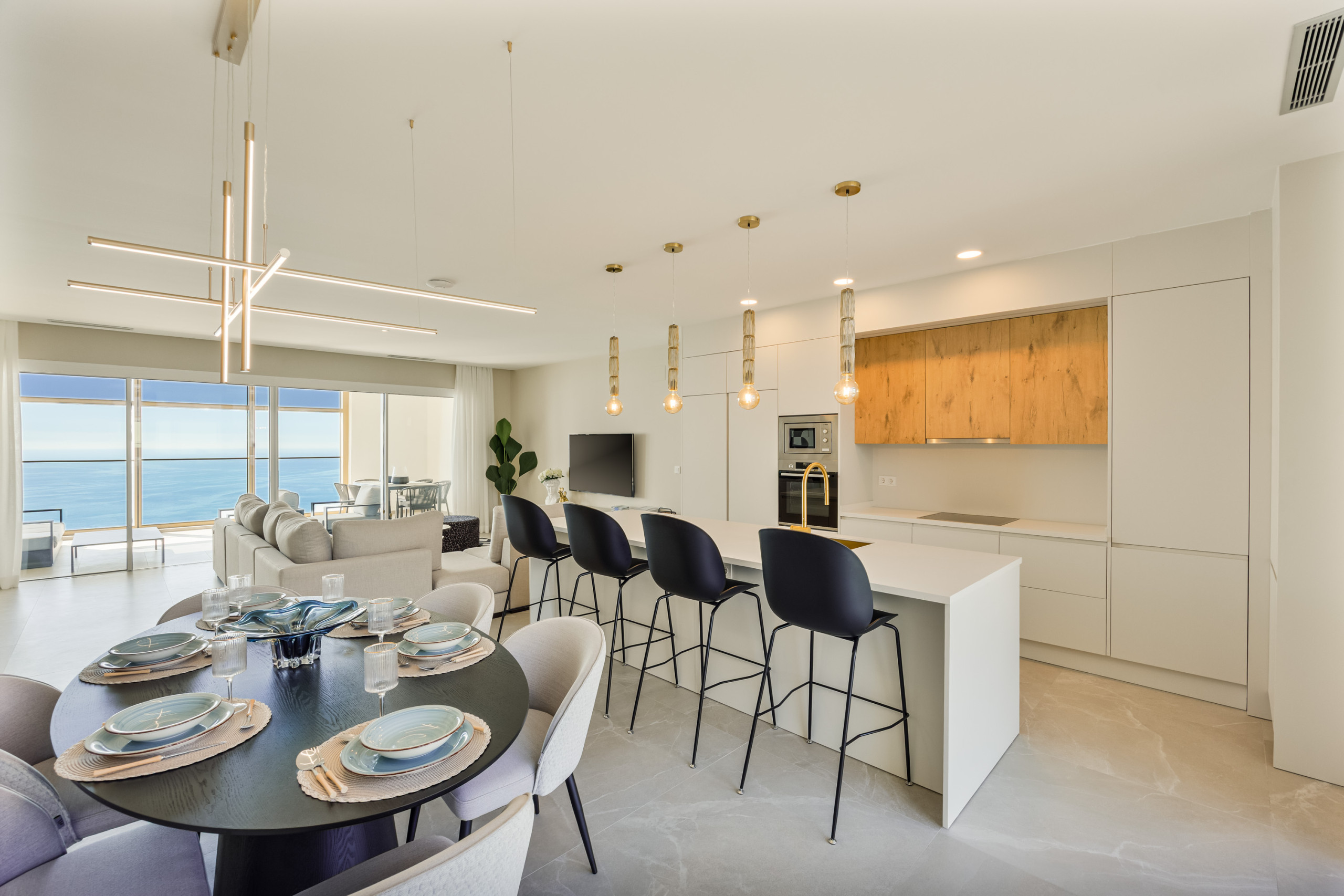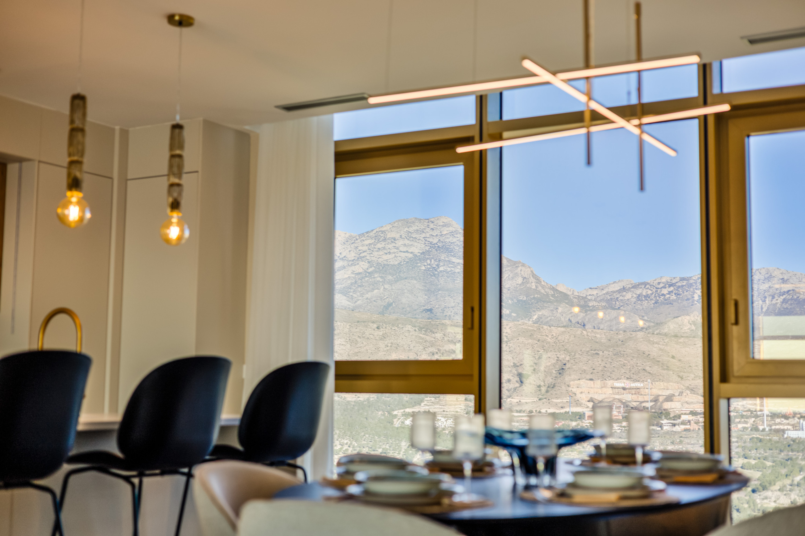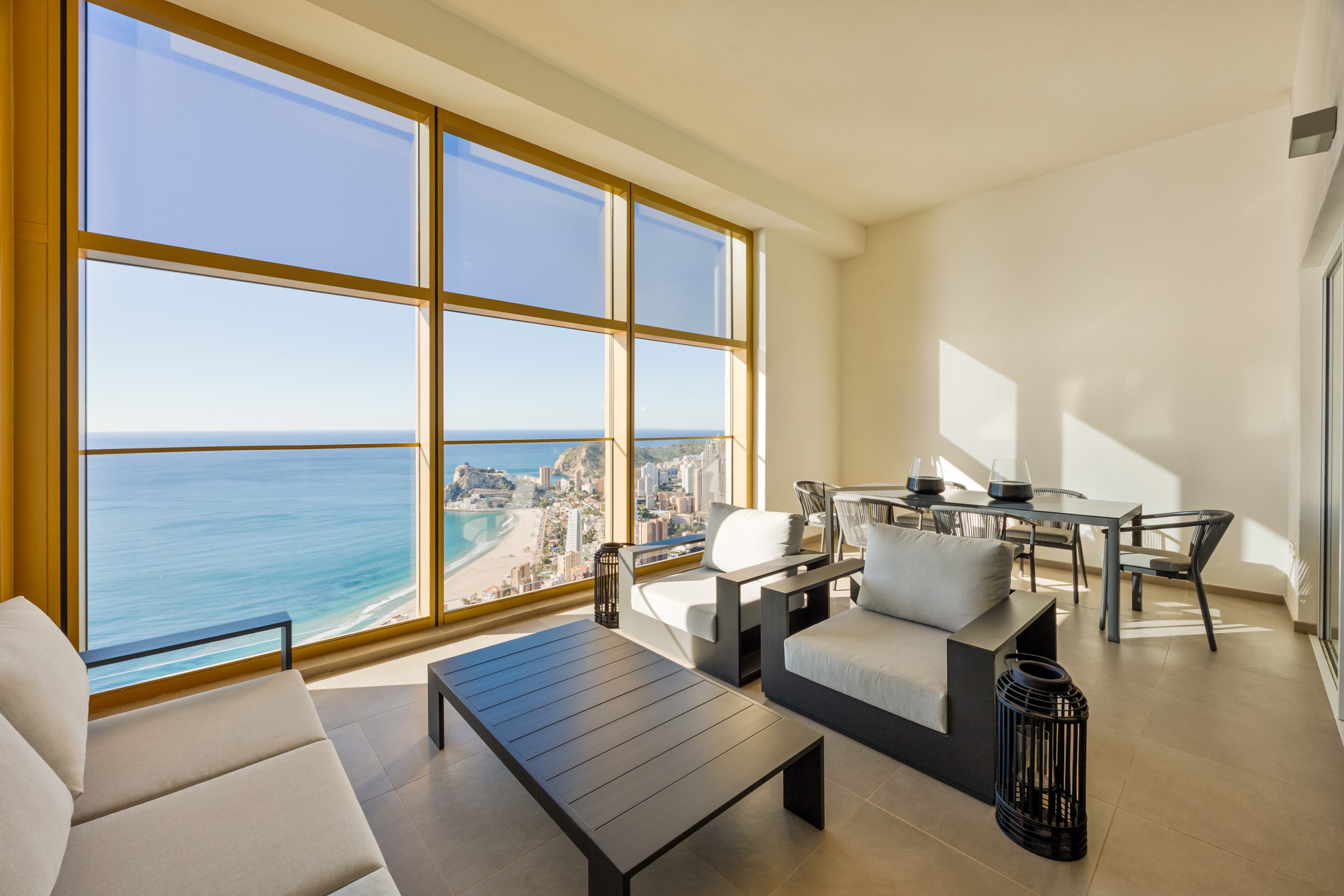 At the heart of the home is its elegant living and dining area, an open, sophisticated, and exceptionally bright space with privileged views of the Mediterranean and the mountains that truly elevate the entire experience. It is the perfect place to enjoy breakfast at sunrise, relax at sunset, or simply take in the unique feeling of being suspended above Benidorm.