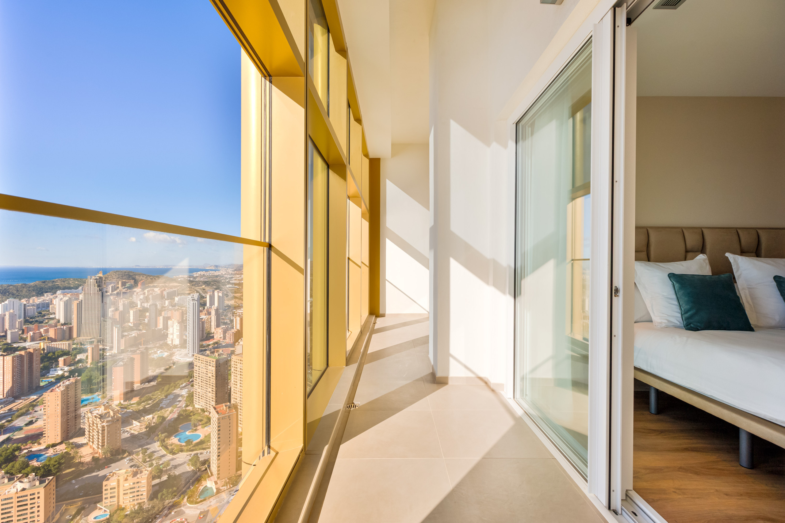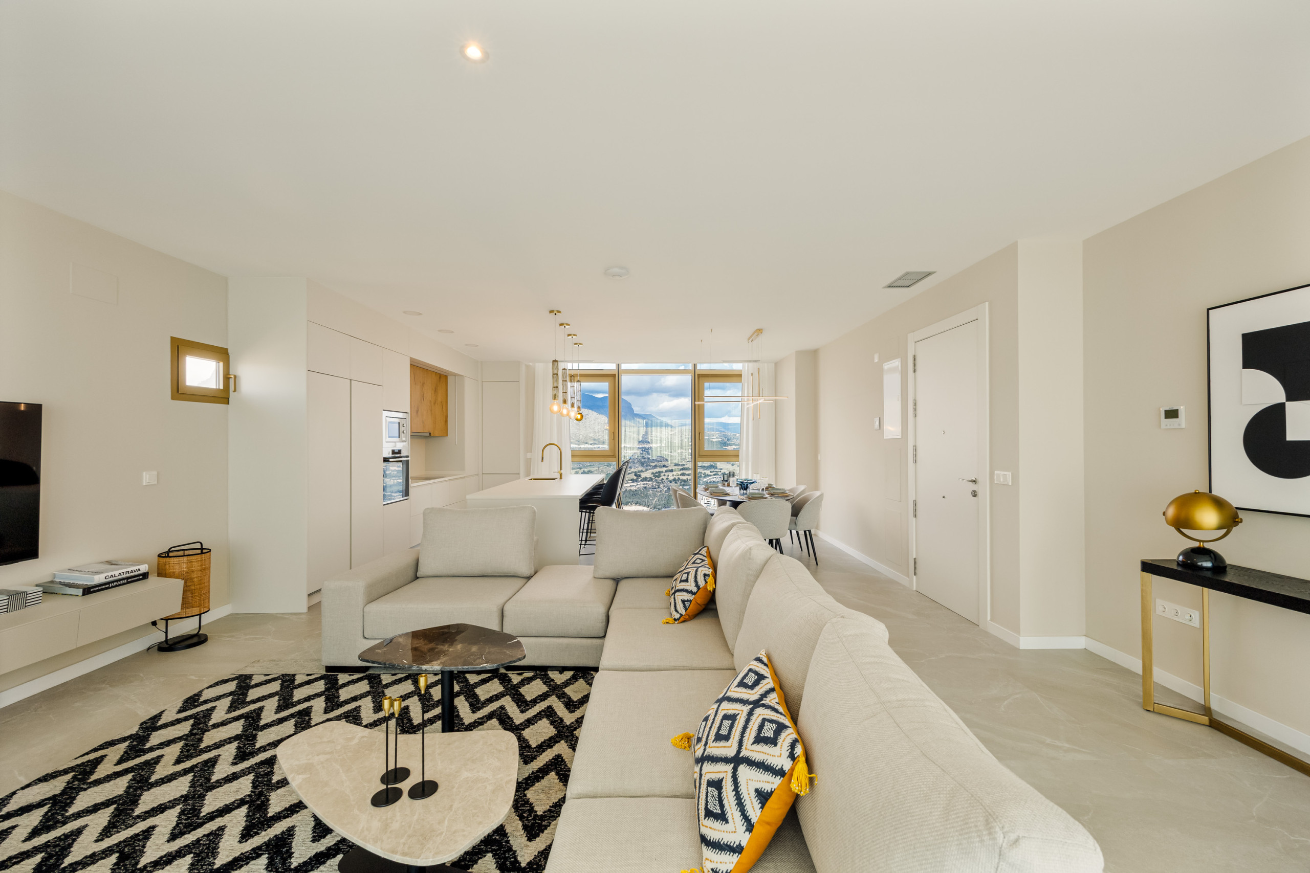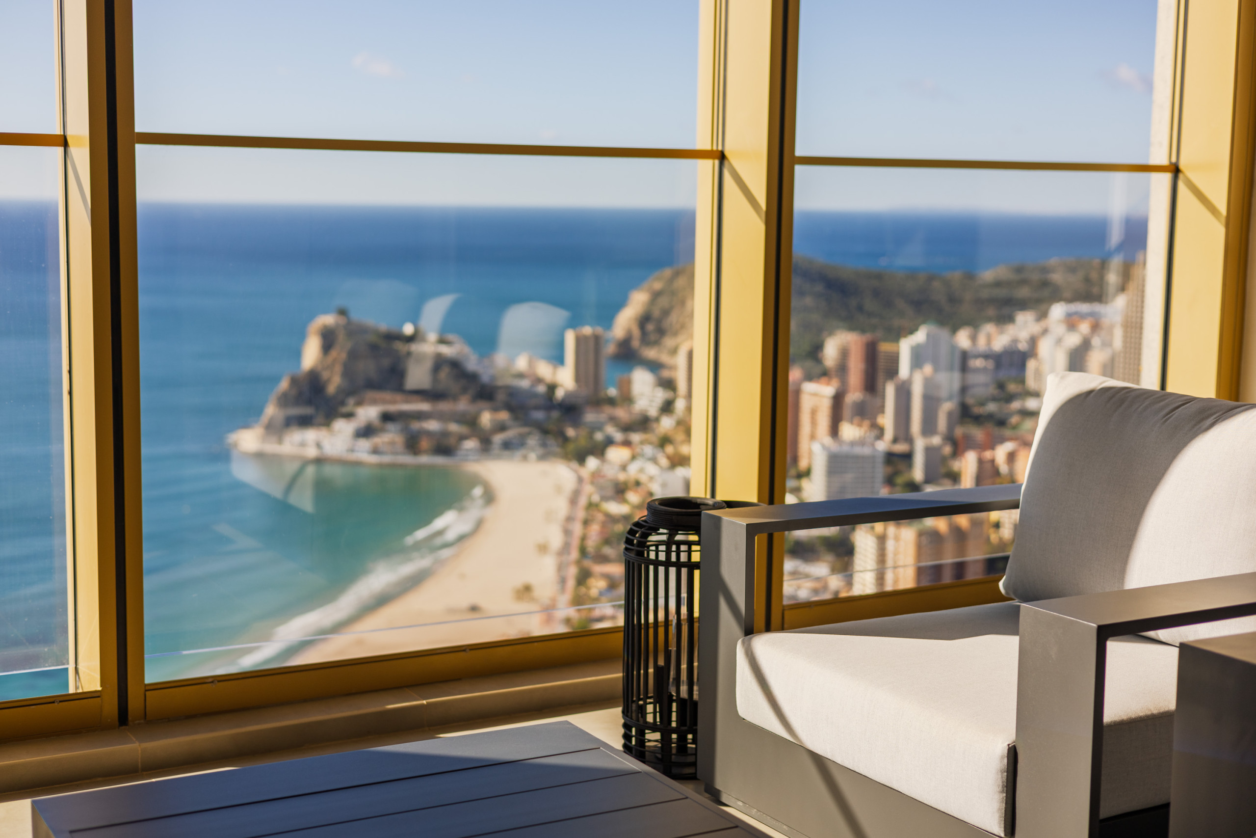 At the heart of the home is its elegant living and dining area, an open, sophisticated, and exceptionally bright space with privileged views of the Mediterranean and the mountains that truly elevate the entire experience. It is the perfect place to enjoy breakfast at sunrise, relax at sunset, or simply take in the unique feeling of being suspended above Benidorm.