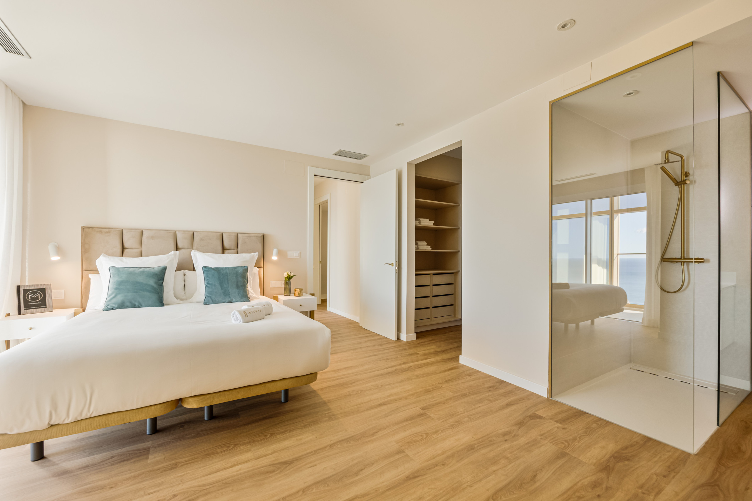 The apartment offers two carefully prepared bedrooms designed for rest and comfort. The master suite provides an intimate and exclusive atmosphere, featuring a queen-size bed, an en-suite bathroom with shower, and a practical walk-in wardrobe, ideal for both short and extended stays.