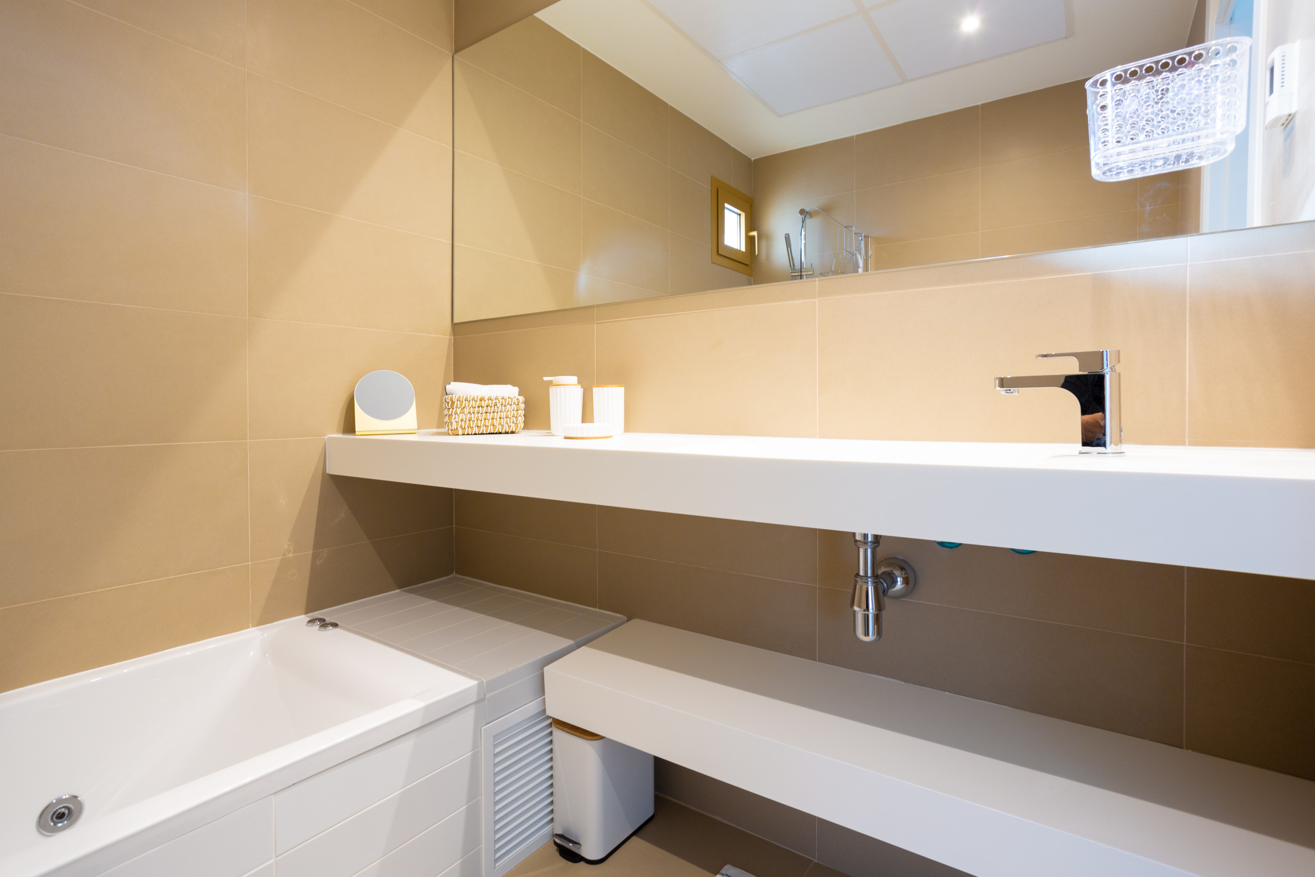 Les installations de l'appartement sont exceptionnelles. Il dispose de deux salles de bains, l'une avec douche et l'autre avec baignoire, facilitant le confort des invités. La cuisine indépendante est entièrement équipée d'électroménagers de marques reconnues tels que lave-linge, lave-vaisselle, four, micro-ondes et cafetière, permettant de préparer des repas pendant le séjour.