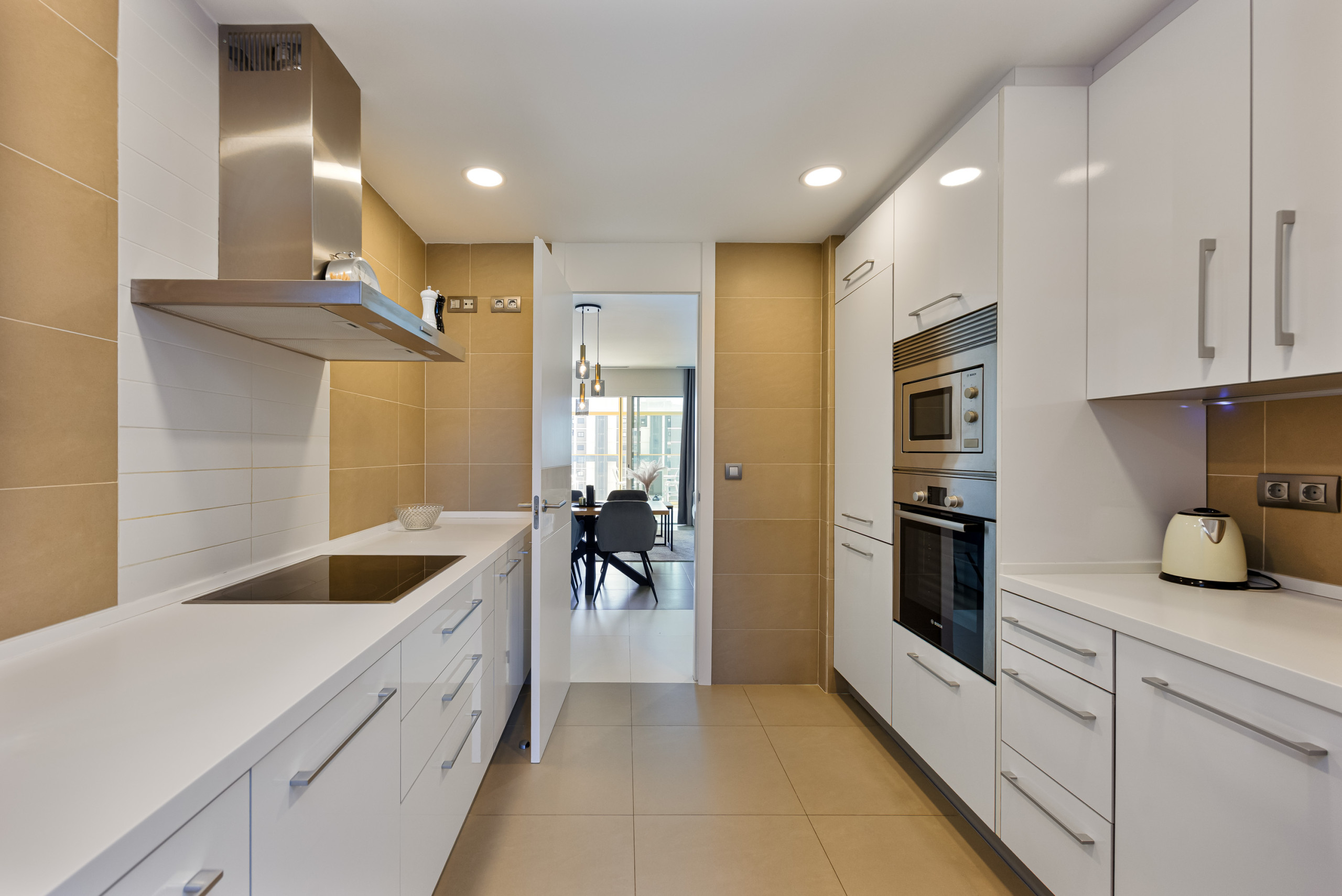 Troverai una cucina moderna e completamente attrezzata con tutto ciò che serve per soggiorni brevi e lunghi: elettrodomestici, stoviglie complete e utensili, e molto spazio di lavoro per cucinare comodamente.